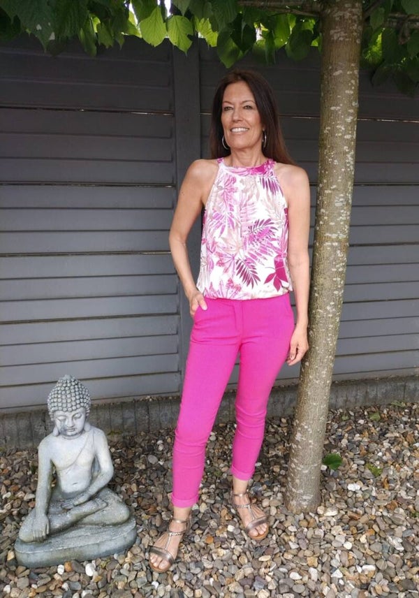 Haltertop travelstof met blad print fuchsia
