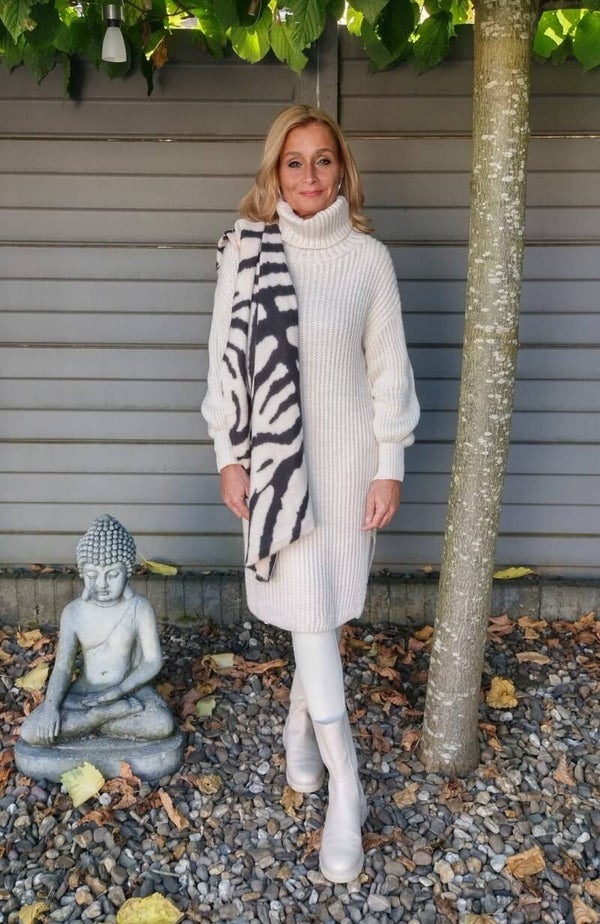 Deze mooie gebreide jurk met col en zijsplitten aan de zoom is een absolute feel-good must-have. Deze comfortabele damesjurk is een harmonieuze combinatie van comfort en stijl en is perfect voor relaxte herfstdagen.