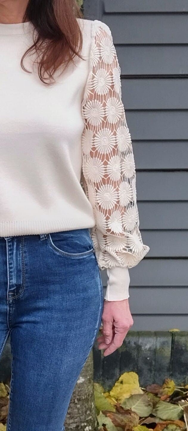 Prachtige trui met opengewerkte mouwen met bloemmotief, een echte eyecatcher in jouw garderobe.