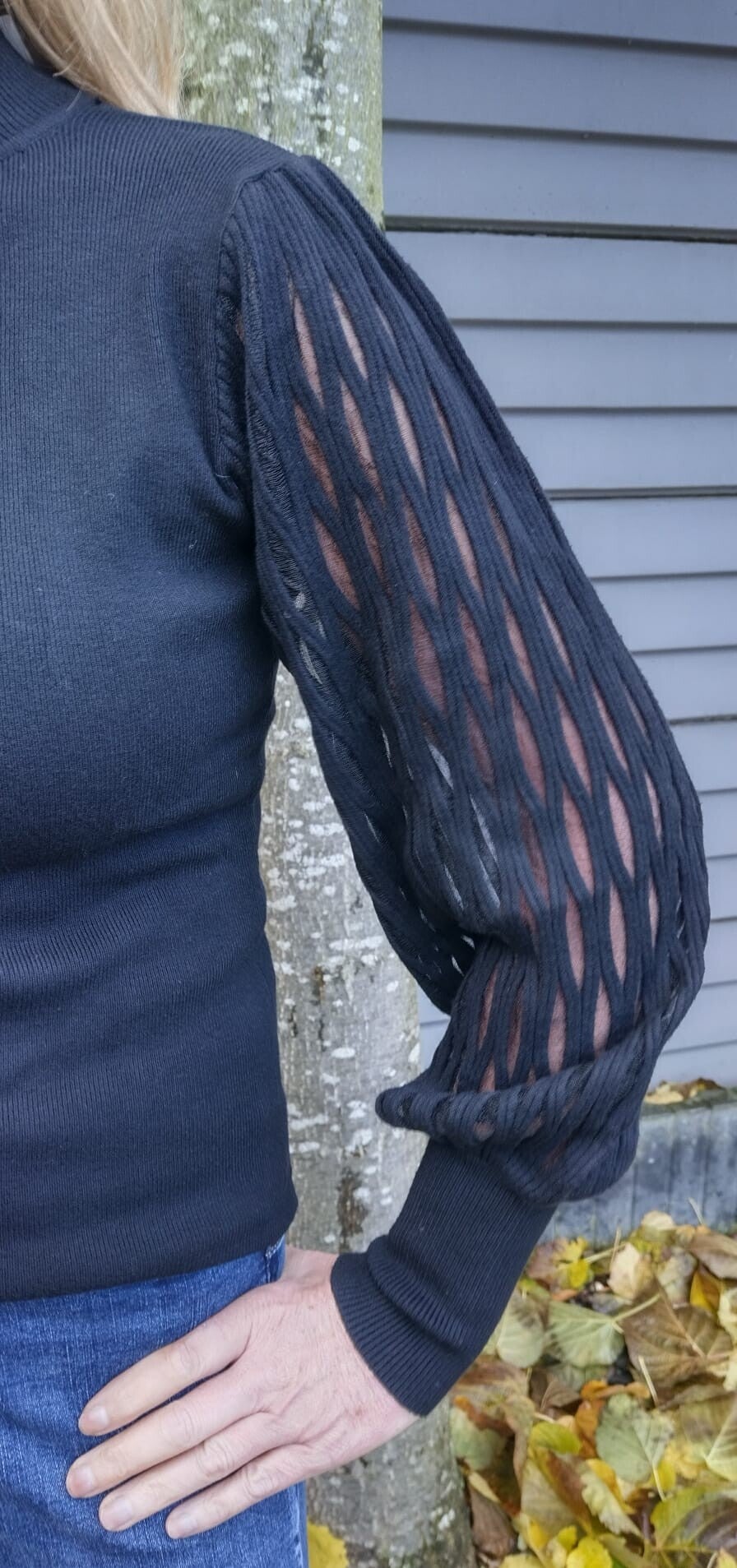 Trui met prachtige opengewerkte mouwen en opstaande kraag. Een echte eyecatcher!