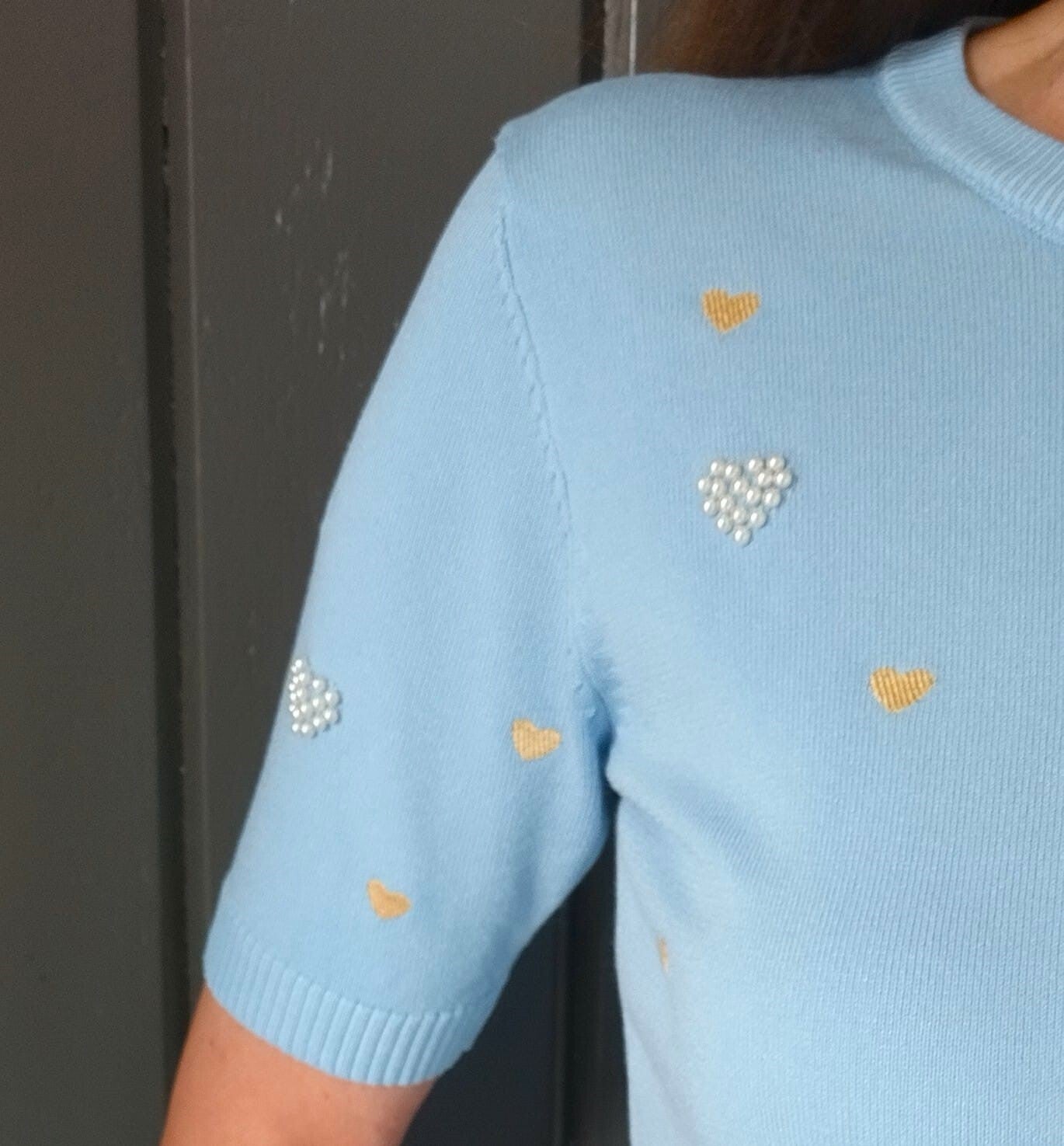 Fijn gebreide top met gouden geborduurde hartjes en hartjes met parels! We love it!